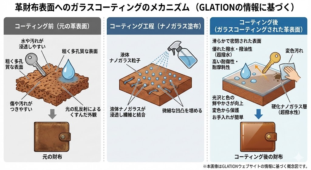 革の表面に、目には見えないナノサイズのガラス成分が入り込み、透明な保護膜を作ります。この膜は約9H(サファイアガラス相当)という硬さを持ちながら、とても薄いので、革の質感や見た目はほとんど変わりません。